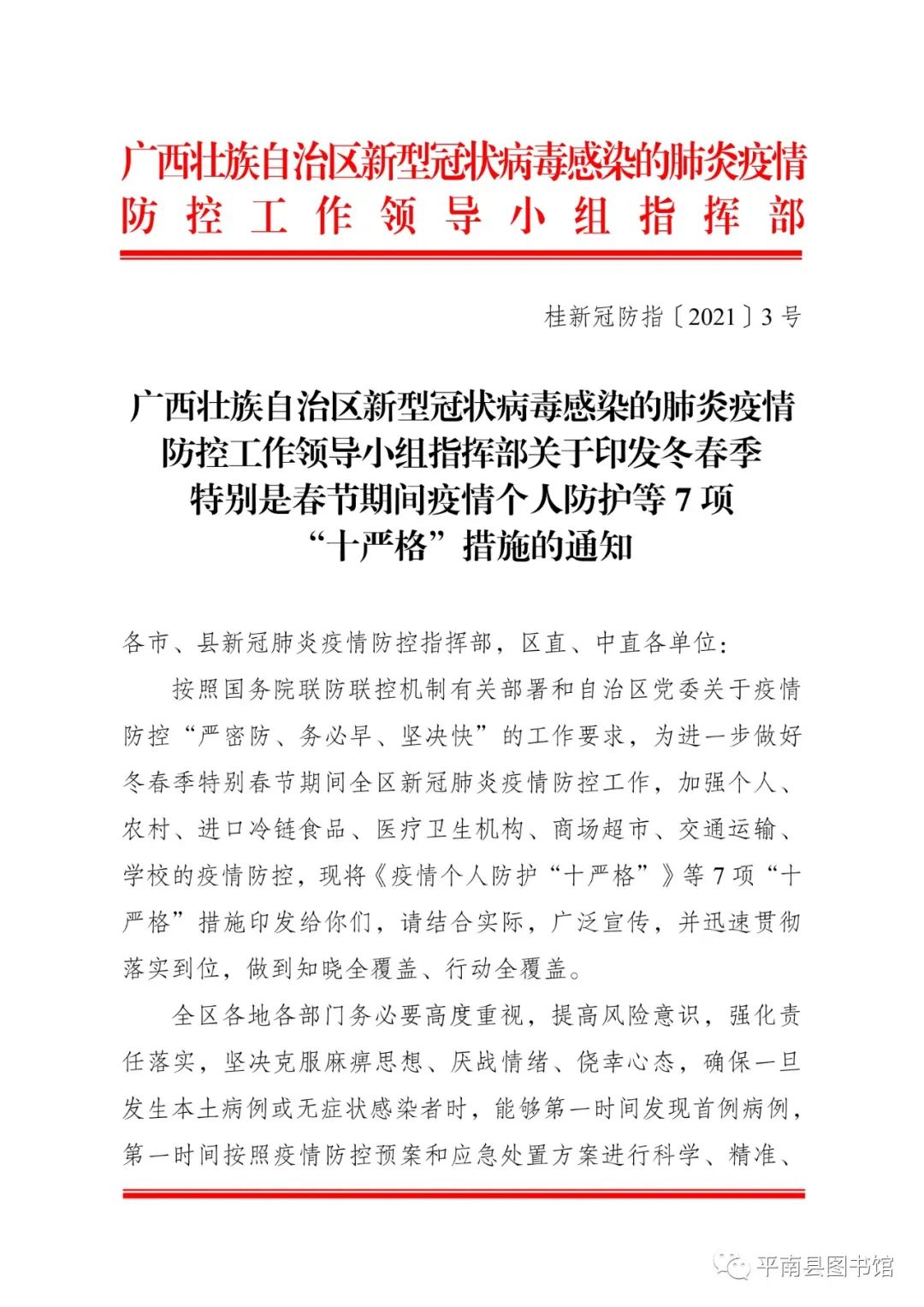 广西壮族自治区新型冠状病毒感染的肺炎疫情防控工作领导小组指挥部关于印发冬春季特别是春节期间疫情个人防护等7项“十严格”措施的通知